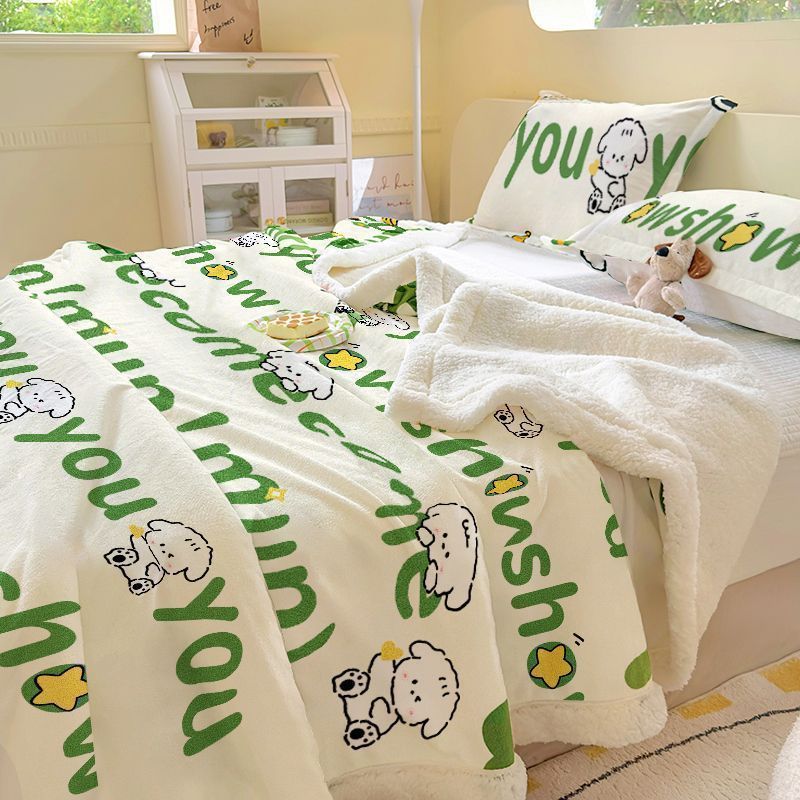 Meet your new favorite winter blanket. This piece is designed with two sides of pure comfort. One side features a charming, cute print (like happy bunnies or flowers) that adds a dash of personality. The other side is a thick, plush sherpa that feels like a soft, warm hug.